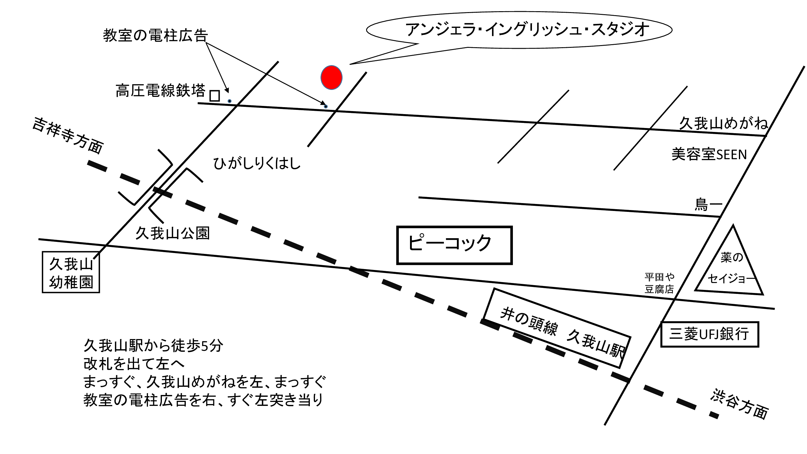![]() Angela English Studio 〒168-0082 東京都杉並区久我山4-10-16 ■公共交通機関をお使いの方 京王井の頭線 ■お車でお越しの方 お車でお越しの方は久我山ピーコックストアの上のコインパーキングをご利用ください。 | ![]() |
